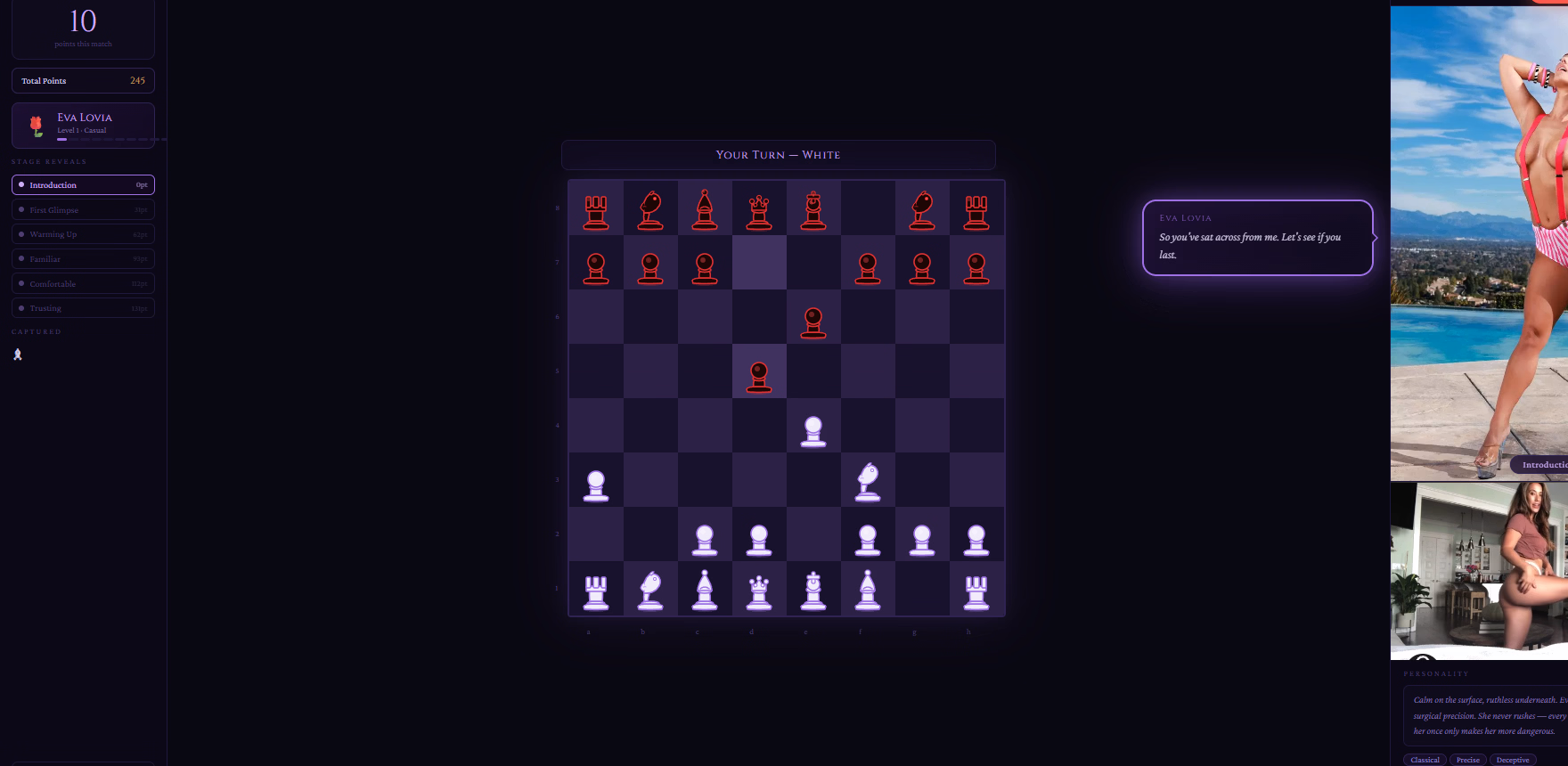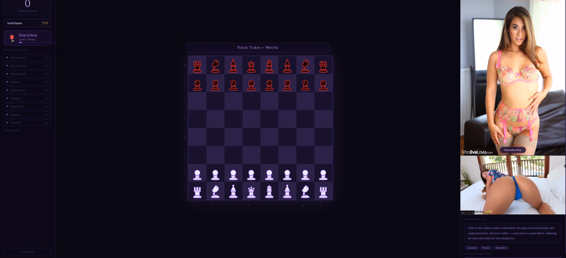 You sit across from seven women. Each one plays differently. Each one thinks differently. And as the game progresses — as you capture pieces, as you prove yourself — she opens up. Stage by stage. Move by move.
